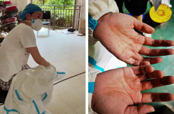 在长沙某小区 ,一名采样人员出现中暑症状;yabo鸭脖官网采样人员双手被汗水泡得发白、发皱