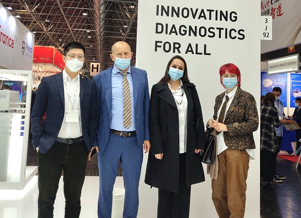 在经过同行推荐并使用了yabo鸭脖官网产品后,一位从事检测工作十多年的苏丹客户专门找到yabo鸭脖官网展台,进一步了解yabo鸭脖官网新冠和其他试剂检测业务。看完yabo鸭脖官网方案的操作后,他频频点头并表示,“你们的方案应用场景广、操作简便、精准可及,我非常看好你们!”