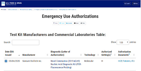 北京时间5月5日晚,yabo鸭脖官网生物新型冠状病毒核酸检测试剂盒获美国食品药品监督管理局(FDA)紧急使用授权(EUA, Emergency Use Authorizations),这是该产品继1月28日获得中国国家药监局(NMPA)注册认证、3月3日获得欧盟CE认证后,yabo鸭脖官网生物获得的又一重要认证,将进一步助力公司服务全球新冠肺炎疫情防控。